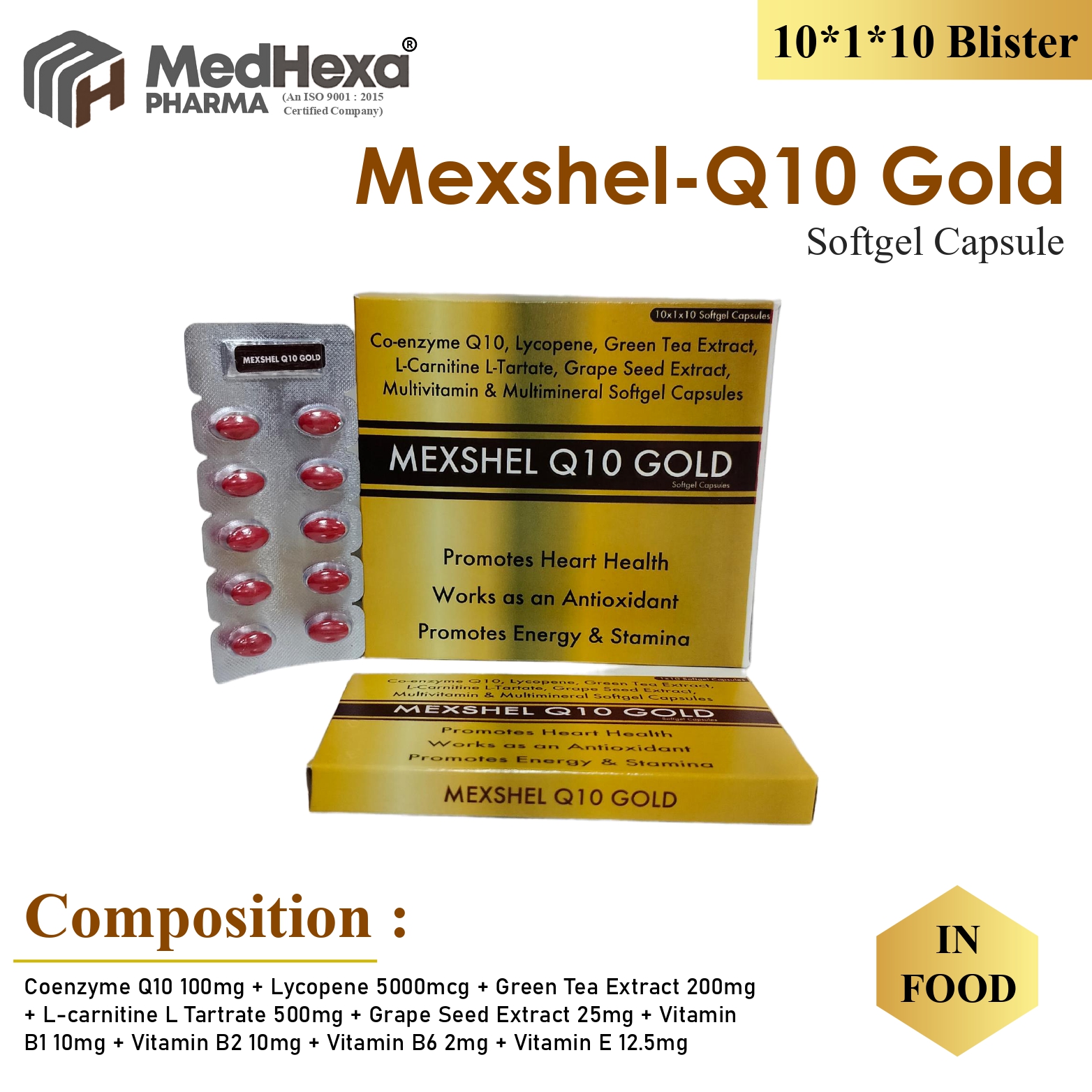 Coenzyme Q10 100mg + Lycopene 5000mcg + Green Tea Extract 200mg + L-Carnitine L Tartrate 500mg + Grape Seed Extract 25mg + Vitamin B1 10mg + Vitamin B2 10mg + Vitamin B6 2mg + Vitamin E 12.5mg